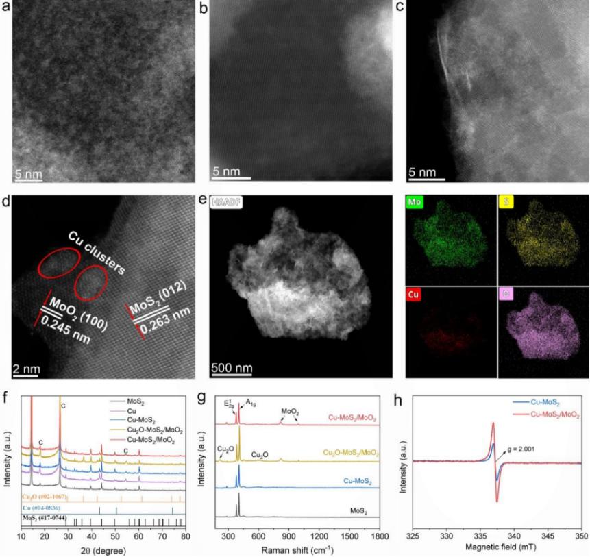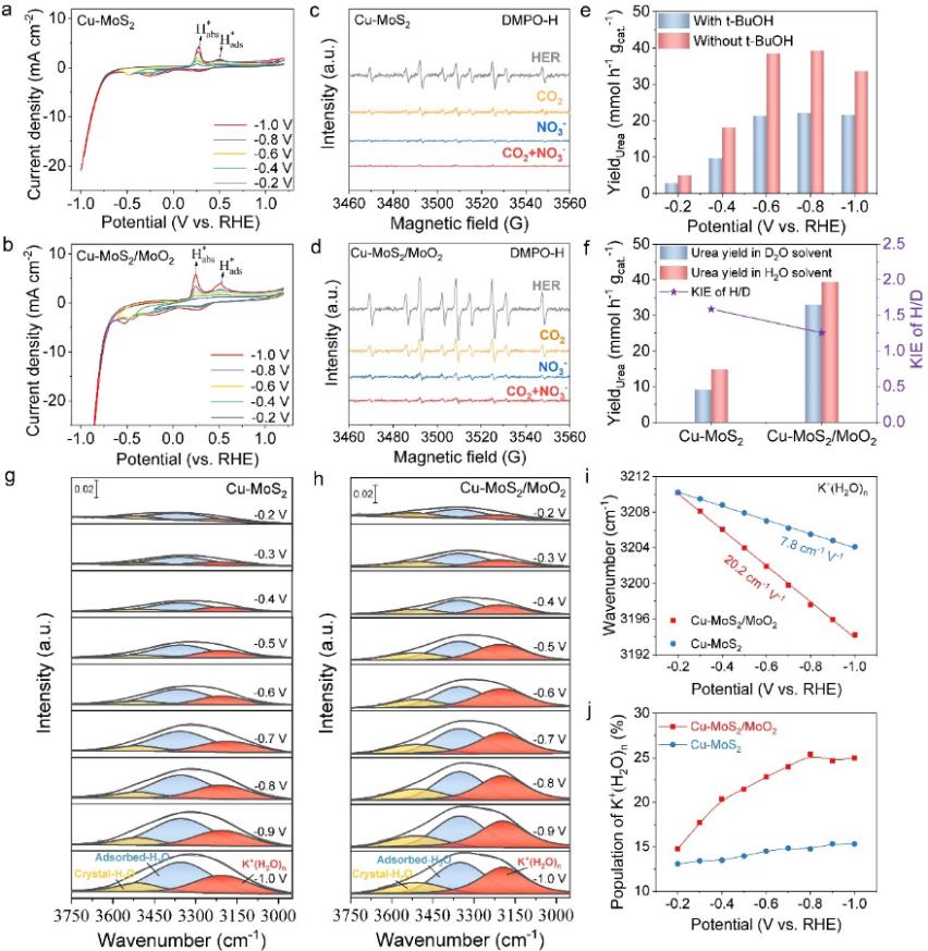 针对上述挑战,吴玉程教授课题组的王岩教授、“香江学者”博士后张剑芳,与澳大利亚国立大学Hark Hoe Tan教授、中国科学技术大学国家同步辐射实验室谈浩博士等人合作,发展了一种基于Cu-MoS2/MoO2协同催化剂的新策略。通过低温液相剥离结合氧化-还原调控,成功将Cu纳米簇均匀锚定于部分氧化的MoS2纳米片中,构建出独特的Cu-MoS2/MoO2异质结构。该结构一方面促进了水分子的吸附与解离,有效释放表面活性氢(*H),另一方面调控了Cu簇的电子结构,从而显著提升了CO2与NO3-中间体的生成及C-N偶联效率。该研究不仅揭示了活性氢在电催化C-N偶联中的关键作用,也为开发高效、可持续的电催化尿素合成体系提供了崭新思路。